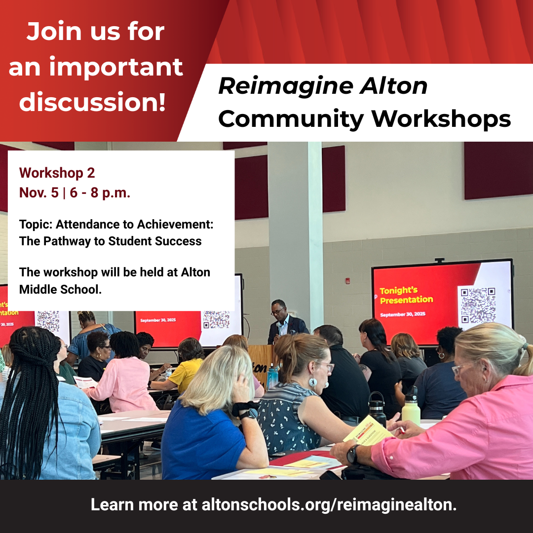 Join Reimagine Alton: Our Story, Our Community, Our Future on Nov. 5 as we focus on attendance and graduation rates. Learn how Alton is addressing key challenges and share ideas on how we can wor. . .